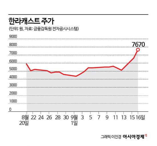 17일 금융투자업계에 따르면 한라캐스트 주가는 지난달 말 4600원에서 전날 7670원으로 66.7% 올랐다.