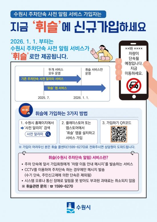 수원시는 내년 1월부터 주차단속 사전 알리미 서비스를 종료하고, 휘슬을 통해서만 단속 알림을 발송할 계획이다.