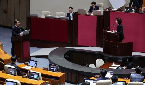 김민석 국무총리가 18일 국회에서 열린 교육·사회·문화 분야 대정부질문에서 나경원 국민의힘 의원의 질의에 답변하고 있다.