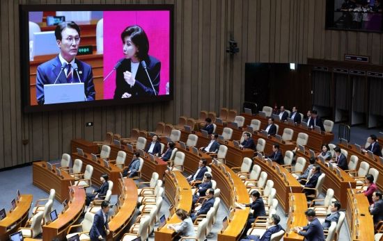 김민석 국무총리가 18일 국회에서 열린 교육·사회·문화 분야 대정부질문에서 나경원 국민의힘 의원의 질의에 답변하고 있다.