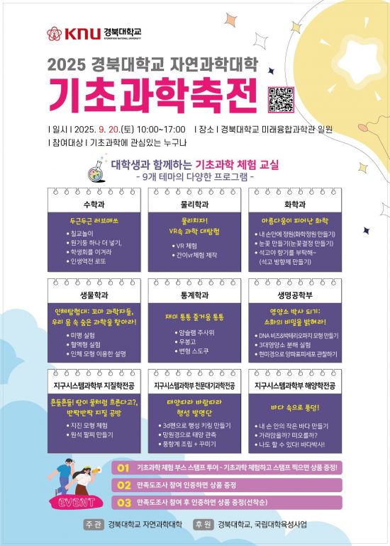 경북대 자연과학대학(학장 조창우)이 기초과학에 관심 있는 대구·경북권 학생과 지역민을 위한 '2025 기초과학축전'을 20일 경북대 미래융합과학관에서 개최한다.