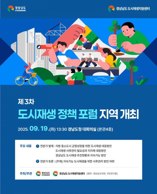 경남도는 오는 19일 오후 1시 30분 도청 대회의실에서 '2025년 제3차 도시재생 정책 포럼'을 연다고 18일 밝혔다.