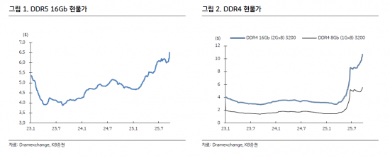 우선 서버향 수요가 메모리 가격 상승을 주도하고 있다. 이달 들어 DDR5 16기가바이트(Gb) 현물가는 8.2% 상승했다. DDR4 16Gb와 8Gb도 각각 14.3%, 14.6% 올랐다. 고용량 서버에 주로 사용되는 D램 현물가격이 범용 D램 대비 큰 폭으로 오르고 있다. 현재 메모리 가격 상승 흐름이 서버 수요로 발생하고 있는 셈이다.