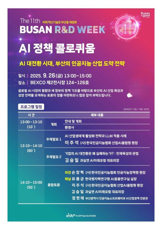 부산시와 부산과학기술고등교육진흥원(원장 김영부, BISTEP)은 오는 26일 벡스코 제2전시장에서 '제11회 부산R&D주간'과 연계해 'AI 정책 콜로퀴움'을 개최한다.