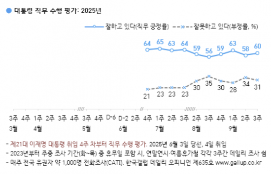 19일 여론조사업체 갤럽이 공개한 여론조사(16~18일 전국 18세 이상 1001명을 대상으로 무선전화를 이용해 전화 조사원 인터뷰 방식으로 진행, 표본오차는 95% 신뢰수준에 ±3.1%포인트, 응답률은 11.8%)에 따르면 이 대통령의 직무수행과 관련해 긍정평가는 지난주보다 2%포인트 오른 60%로 나타났다. 부정평가는 3%포인트 하락한 31%로 조사됐다.