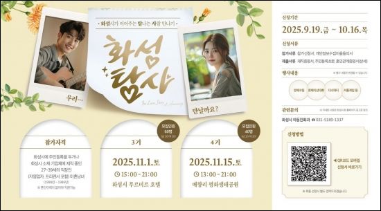 화성시에 주소를 두거나 화성시 소재 기업체, 자영업체, 공공기관 등에 재직 중인 27~39세의 직장인 미혼남녀면 참가할 수 있다. 희망자는 홍보 포스터의 QR코드 또는 화성시통합예약시스템에서 관련 서류를 첨부해 신청하면 된다.