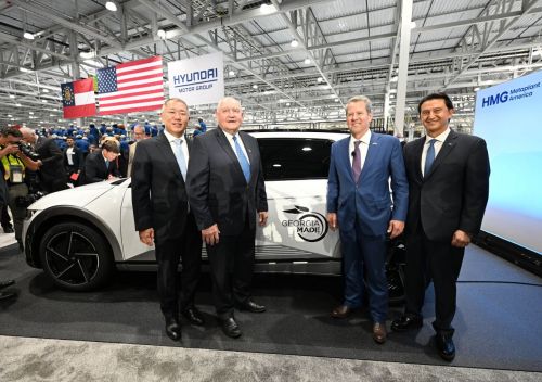 정의선 현대차그룹 회장이 지난 3월 26일(현지시간) 미국 조지아주 엘라벨에서 열린 '현대자동차그룹 메타플랜트 아메리카'(HMGMA) 준공식에서 아이오닉 5 차량 앞에서 참석자들과 기념 촬영하고 있다. 왼쪽부터 정의선 현대차그룹 회장, 소니 퍼듀 전 조지아 주지사, 브라이언 캠프 조지아 주지사, 호세 무뇨스 현대차 대표이사 사장. 현대자동차·기아 제공 연합뉴스