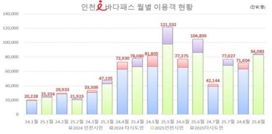 한편 '아이(i) 바다패스'는 올해 인천시 10대 주요정책 시민 만족도 조사에서 1위로 뽑혔으며, 한국관광공사 주관 '2025 한국 관광의 별' 혁신관광정책 부문 평가대상(국민추천) 후보로 선정돼 오는 11월 최종 발표를 앞두고 있다.