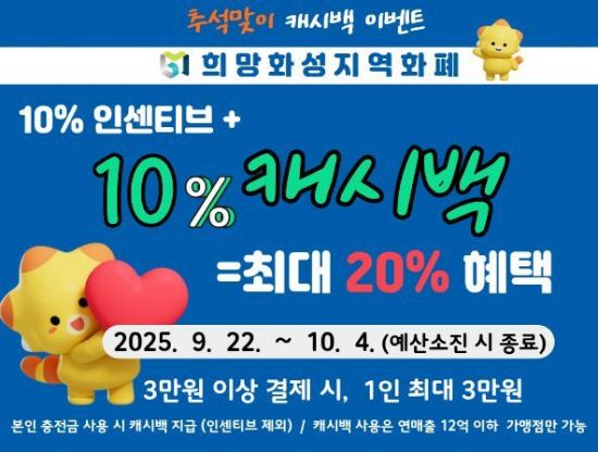 경기도 화성시는 추석을 앞두고 다음 달 4일까지 지역화폐인 '희망화성지역화폐' 사용자에게 결제 금액의 10%를 돌려주는 캐시백 이벤트를 실시한다.