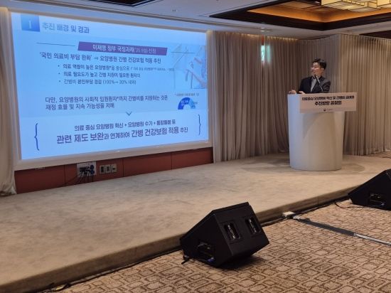 22일 서울 중구 로얄호텔에서 열린 '의료중심 요양병원 혁신 및 간병 급여화 추진방향 공청회'에서 이중규 보건복지부 건강보험정책국장이 요양병원 간병비 일부를 건강보험으로 보장하는 방안을 설명하고 있다.