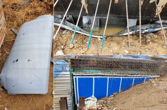 경기 LH 아파트 건설 현장. (맨왼쪽)지하주차장 외벽 방수에 쓰일 시트 자재가 찢기고 구겨진 채 방치돼 있다. (오른쪽 상단)외벽 방수 시공 후 끝단 마감이 누락돼 시트가 들뜨고, 내부에 빗물이 고인 모습. 비가 내리자 외벽을 타고 스며든 물이 시트 안쪽에 고여 방수층 전체가 손상됐다. (오른쪽 하단)LH 품질명장이 해당 부위를 확인한 뒤 전체적으로 다시 걷어내고 보수해야 한다고 지적해 재시공한 구간으로, 손상된 구간을 걷어내고 끝단을 스테인리스 판으로 고정한 뒤 새 시트를 부착한 모습. 파란색 보호판을 덧대 흙을 되메움할 때 방수층이 다시 손상되지 않도록 마감했다.