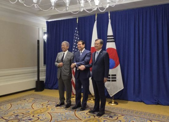 이번 주 미국 뉴욕에서 열리는 유엔(UN) 총회 고위급 회기를 계기로 22일(현지시간) 만난 조현 외교부 장관(맨 오른쪽부터), 마코 루비오 미 국무부 장관, 이와야 다케시 일본 외무상이 기념 촬영을 하고 있다. 이번 한미일 외교장관 회의에서 세 장관은 한미일 안보 협력을 주요 의제로 북한 핵·미사일 위협 대응 방안 등을 논의한 것으로 보인다.