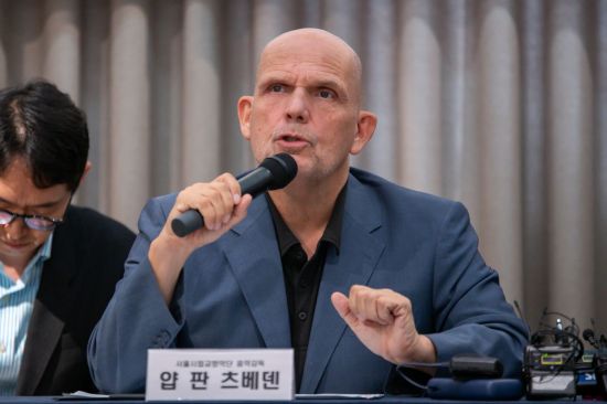 얍 판 츠베덴 서울시립교향악단 음악감독이 23일 서울 종로구 더프리마아트센터에서 열린 서울시향 신작 발표 기자간담회에서 정재일 음악감독에게 작품을 위촉한 이유를 설명하고 있다. [사진 제공= 서울시립교향악단]