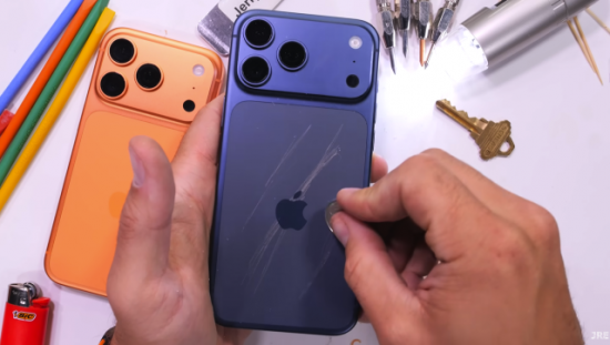 한 IT 유튜버가 아이폰17 후면을 동전으로 긁고 있다. 슬쩍 긁기만 해도 스크래치가 쉽게 생기는 것을 확인할 수 있다. 유튜브 채널 '제리릭에브리띵(JerryRigEverything)' 영상 캡처