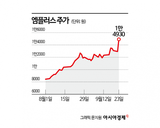 23일 금융투자업계에 따르면 엠플러스 주가는 1만4930원으로 지난 7월 말 8790원 대비 69.9% 올랐다. 이 기간 외국인과 기관 투자가가 각각 78억원, 25억원 누적 순매수를 기록했다. 외국인의 평균 매수가격은 1만2114원으로 평가수익률 23%를 기록했다.