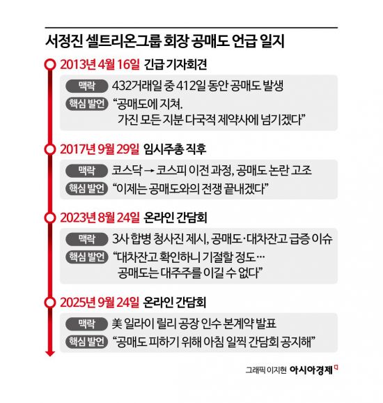 셀트리온과 공매도의 악연은 2010년대 초반까지 거슬러 올라간다. 회사 가치가 급등할 때마다 '실적 대비 고평가'라는 명분으로 외국계 헤지펀드가 숏포지션을 늘렸고, 임상 실패 가능성이나 회계 이슈가 불거질 때면 공매도 공세는 집중됐다. 2013년 4월 서 회장은 긴급 기자회견을 열고 "지난 2년간 432거래일 중 412일간 공매도가 발생했다"며 지분 전량 매각 가능성까지 언급할 정도로 압박을 받았다. 2018년 코스피 이전 직후에도 외국인 공매도 잔고율은 단숨에 10%를 넘어서며 주가를 짓눌렀다.