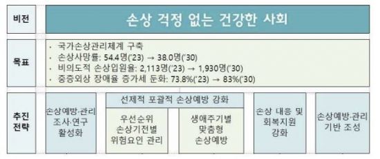 정부는 우선 2023년 기준 인구 10만 명당 54.4명이었던 손상사망률을 2030년에는 38.0명까지 약 30% 낮춘다는 계획이다. 인구 10만명당 2113명인 비의도적 손상입원율도 1930명으로 감소시키는 것이 목표다. 또한 중증외상 장애율의 증가세를 둔화시켜 2023년 73.8%에서 2030년에는 83% 수준으로 억제할 예정이다.
