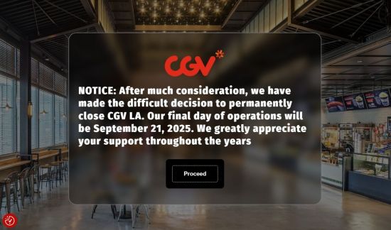 미국 CGV는 최근 홈페이지를 통해 "고심 끝에 CGV LA 지점을 영구 폐쇄한다는 어려운 결정을 내렸다"며 마지막 영업일을 지난 21일(현지시간)로 공지했다.
