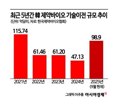 25일 업계에 따르면 올해 9월 현재 국내 제약·바이오 기업의 기술이전 계약 총액은 98억9000만달러(약 13조8954억원)를 기록했다. 지난해 연간 기술이전 총액인 47억1300만달러(약 6조3908억원)를 훌쩍 넘어선 데 이어 2021년 역대 최대 기술이전 규모인 115억7400만달러(약 15조6943억원)를 넘보고 있다. 그간 제약·바이오 기업의 기술이전 계약 규모는 상용화 단계에 이르렀을 때만 받을 수 있는 '장밋빛 숫자'일 뿐이라는 회의론이 있었다. 하지만 기술이전에 따른 계약금·마일스톤(단계별 기술료) 뿐만 아니라 상용화에 따른 로열티를 실제 현금흐름으로 만들어내는 우리 제약·바이오 기업들이 늘어나고 있다.