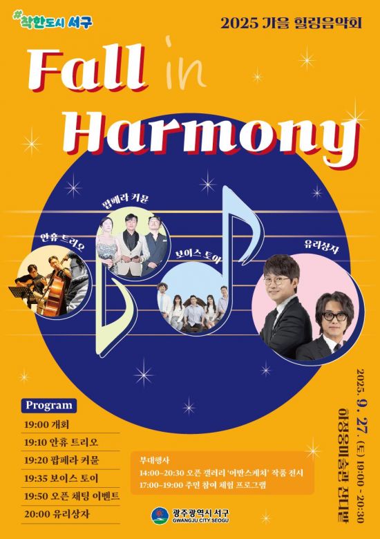 광주시 서구가 오는 27일 오후 7시 농성동 하정웅미술관 앞 잔디광장에서 '폴 인 하모니(Fall in Harmony)' 가을 힐링음악회를 연다.