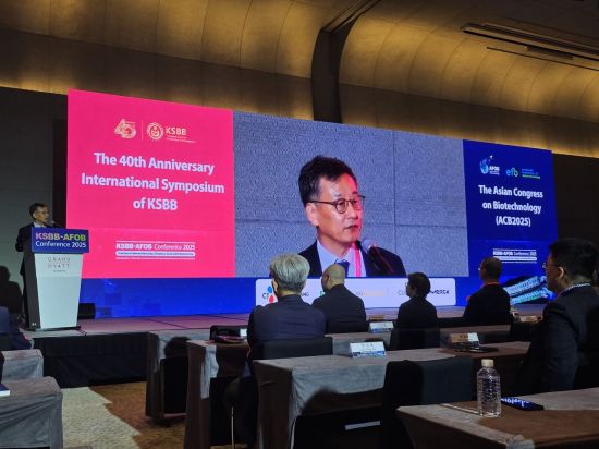 24일 인천 그랜드하얏트 호텔에서 개막한 한국생명공학회 주최 'KSBB-AFOB 콘퍼런스 2025'에서 김동명 한국생명공학회 회장이 인사말을 전하고 있다. '한국-OECD 합성생물학 워크숍'은 이 행사의 부속 행사로 개최된다. 김종화 기자