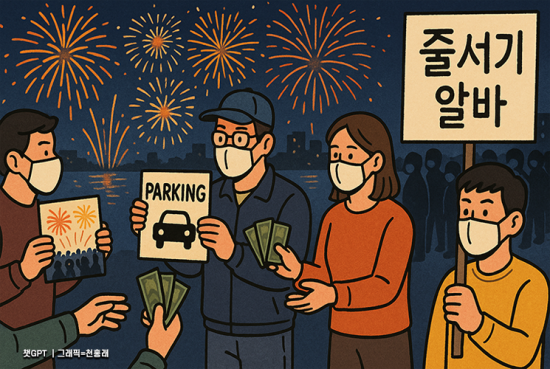 대표적인 게 불꽃놀이가 잘 보이는 명당자리에 아침부터 돗자리를 깔고 자리를 맡아주는 아르바이트다. 보수는 약 5만원에서 10만원 사이. 축제 당일 알바를 고용했다는 직장인 이정주씨(29)는 "1년에 한 번뿐인 축제인데, 힘들게 보는 것보다 돈을 쓰고 편하게 즐기는 것도 나쁘지 않다고 생각한다"고 말했다.