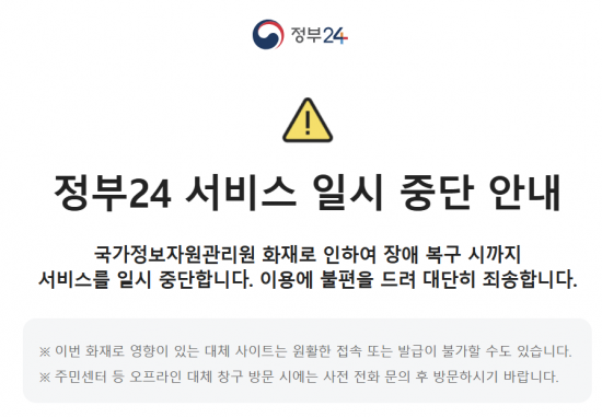 이번 화재로 국무총리실 홈페이지를 비롯해 기획재정부 등 주요 정부부처 홈페이지가 먹통이 됐다. 대국민 서비스를 제공하는 정부 업무시스템 647개가 중단됐고, 정부 온라인 민원서비스 '정부24'도 접속이 불가능하다. 정부 내부 문서작성, 결재 등 업무를 통합 운영하는 내부 전산망인 '온나라시스템'도 먹통이 돼 공무원 업무에 차질을 빚고 있다.