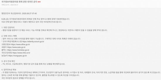 행정안전부는 27일 공지를 통해 "다수 행정서비스 이용이 제한되고 있다"며 포털사이트 네이버 공지를 통해 국민 행동요령을 안내했다.