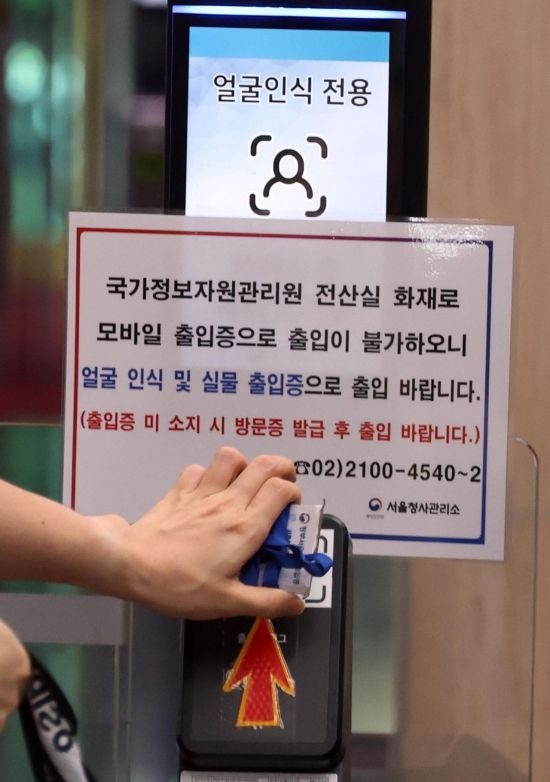 국가정보자원관리원 화재로 정부 전산망이 사실상 마비된 가운데 29일 서울 종로구 정부서울청사 내 출입구에 '국가정보자원관리원 화재로 모바일 출입증으로 출입 불가' 안내문이 붙어 있다.