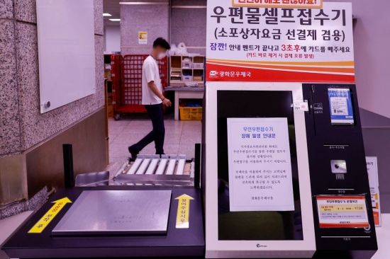 국가정보자원관리원 대전 본원 전산실 화재로 전산망 마비 사태가 이어지고 있는 29일 서울 종로구 광화문우체국에 설치된 무인우편접수기에 우편물 접수 불가 안내문이 붙어 있다. 강진형 기자
