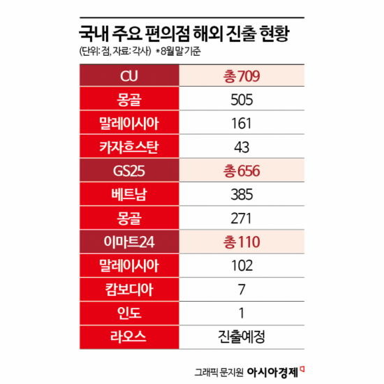 다만 편의점 기업의 해외 매출 비중은 아직 미미한 수준이다. GS25는 지난해 해외 법인(베트남·몽골)에서 2041억원의 매출을 기록했다. 이는 같은 기간 전체 매출(11조원)의 2% 수준이다. CU의 해외 매출 비중은 전체 매출 중 4% 내외다.