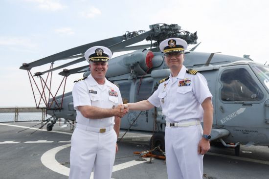 29일 부산 해군작전사령부에 정박해 있는 미 7함대 상륙지휘함 블루릿지함에서 루이스 카탈리나 블루릿지 함장(왼쪽)과 강형구 해군작전사령부 전투발전참모처장이 인터뷰 종료 후 악수하고 있다. 사진=국방일보.
