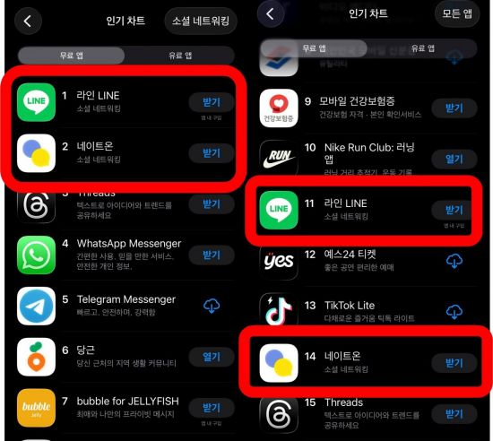 30일 애플 앱스토어 '소셜 네트워킹'을 카테고리에서 현재 라인과 네이트온이 각각 1위와 2위에 올랐다. 전체 앱 순위에서도 라인은 11위, 네이트온은 14위에 올라 있다. 애플 앱스토어