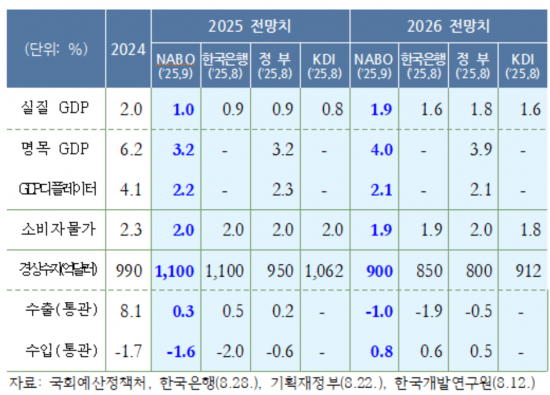 예정처는 이날 '2026년 NABO 경제전망: 2025~2029' 보고서를 통해 내년도 경제 전망을 내놨다. 이번 전망치는 한국은행 등 주요 기관의 전망치보다 높은 수준이다. 앞서 한국은행은 올해 0.9%, 내년 1.6%를 전망했다. 한국개발연구원(KDI)은 오랳 0.8%, 내년도 1.6%를 예상했다.