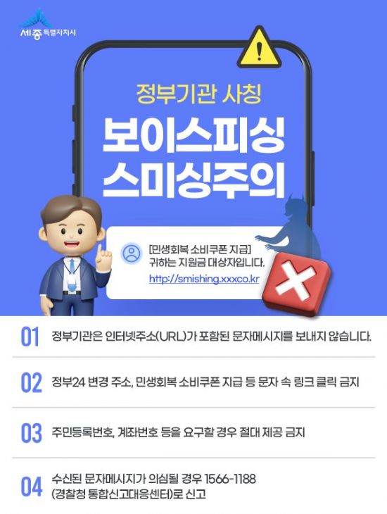 30일 세종시에 따르면 화재로 인한 시스템 장애 등을 이유로 정부 기관을 사칭한 전화 금융사기(보이스피싱)와 문자메시지 사기(스미싱) 등 범행 시도가 우려되고 있다고 밝혔다.