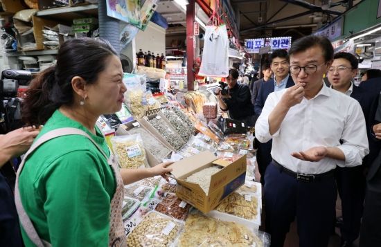 추석 명절을 앞두고 전재수 해양수산부 장관이 1일 서울 마포구 농수산물시장을 방문, 직접 구매한 국내산 멸치를 시식하고 있다. 전 장관은 이 날 장바구니 물가를 점검하고 온누리상품권 환급행사 현장을 둘려봤다.