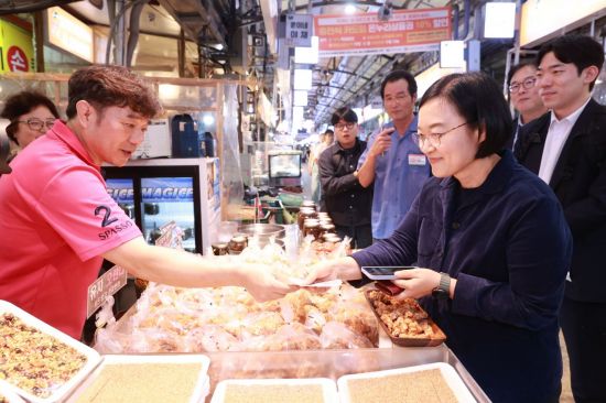 이후 한 장관은 가업 승계한 청년상인 점포와 시장 내 여러 점포를 방문해 한과, 강정, 송편 등을 직접 구매하고 상인들을 격려했다.