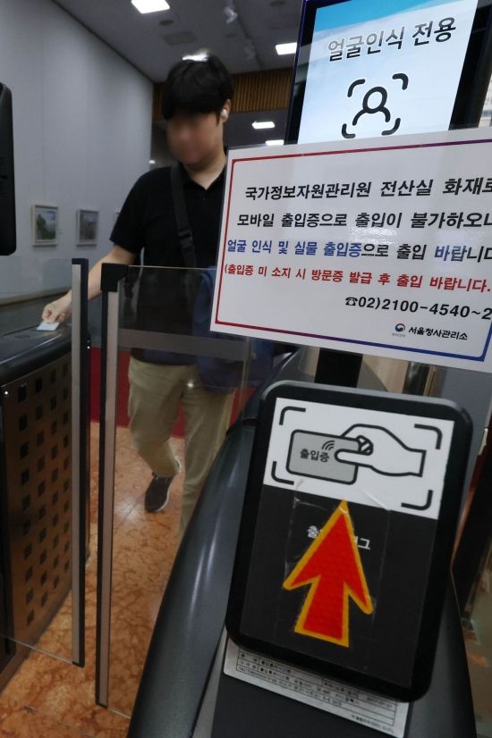 국가정보자원관리원 화재로 정부 전산망이 사실상 마비된 가운데 지난달 29일 서울 종로구 정부서울청사 내 출입구에 '국가정보자원관리원 화재로 모바일 출입증으로 출입 불가' 안내문이 붙어 있다. 2025.9.29 조용준 기자