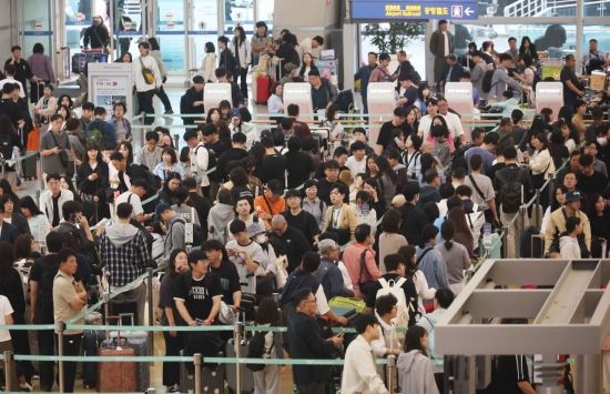 추석 황금연휴를 앞둔 2일 인천국제공항 제1여객터미널을 찾은 여행객들이 발권하기 위해 줄을 서고 있다.