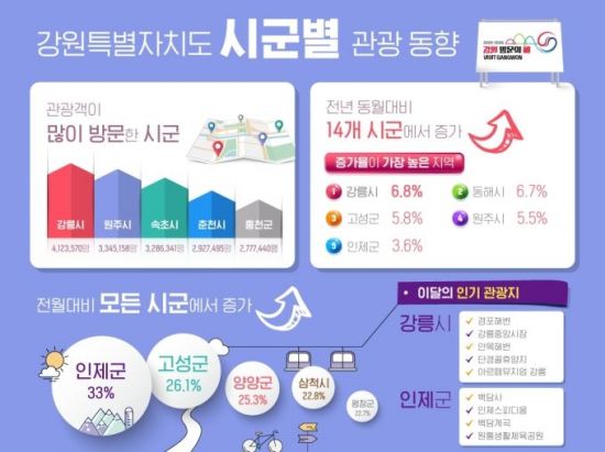 지난 8월은 전년 동월 대비 14개 시군에서 관광객이 증가했으며, 이 중 강릉시가 전년 동월대비 가장 높은 관광객 증가율(6.8%)을 기록하였다.