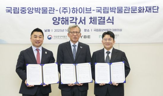 협약에 따라 세 기관은 ▲국립박물관상품 '뮷즈(MU:DS)'와 하이브 뮤직그룹 아티스트 IP를 결합한 상품 개발 및 사업화 ▲하이브 글로벌 유통 네트워크를 통한 해외 시장 진출 ▲국립중앙박물관 소장품과 콘텐츠 확산을 위한 홍보 협력 등을 추진한다.