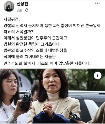 신상진 성남시장이 조희대 대법원장을 둘러싼 정치권의 압박 움직임에 대해 "법관의 최고수장을 국회로 불러내 찍어내려는 자들은 민주주의의 적(敵)이며 이미 파쇼와 입맞춤한 자들"이라고 강하게 비판했다.