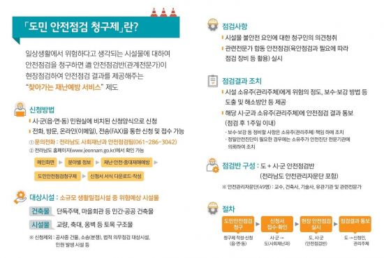 전라남도는 각종 재난으로부터 도민의 생명과 재산을 보호하고 일상 생활 주변에 불안전한 위험 요소를 찾아 무료로 안전 점검하는 '도민 안전 점검 청구제'를 운영하고 있다고 밝혔다.