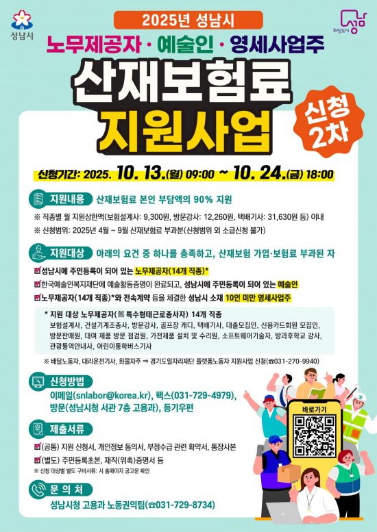 지원 대상은 △ 성남시에 주민등록이 되어 있는 노무제공자(14개 직종)와 예술인 △ 이들과 전속계약 등을 체결한 성남시 소재 10인 미만 영세사업주다. 직종별 월 지원 상한액 범위 내에서 근로자가 납부한 산재보험료 본인 부담금의 90%를 지원한다. 이번 신청 범위는 2025년 4월부터 9월까지의 산재보험료 부과분(최대 6개월분)이며, 기간 외 소급 지원은 불가하다.