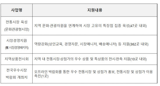 전통시장 및 상점가 활성화 지원사업은 전통시장 육성(문화관광형시장)·시장경영지원(舊 시장경영패키지)·지역상품전시회·전국우수시장박람회 개최지 등 총 4개 사업에 대해 모집한다. 모집 기간은 13일부터 내달 7일까지다.