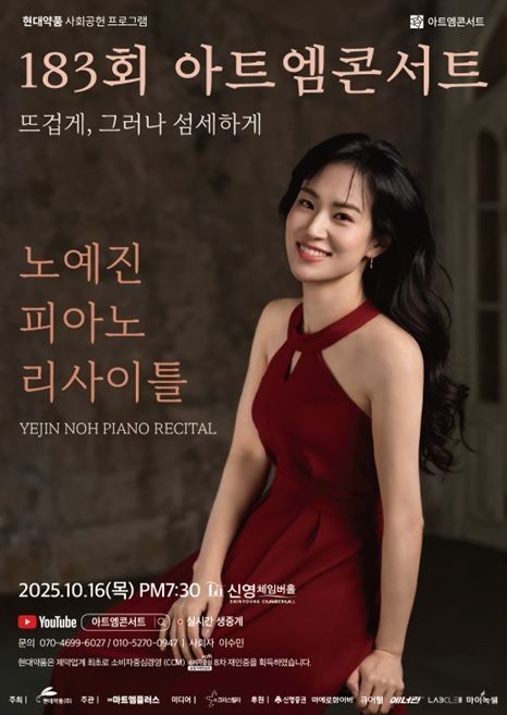 현대약품이 오는 16일 서울 영등포구 신영체임버홀에서 제183회 아트엠콘서트 '노예진 피아노 리사이틀 : 뜨겁게, 그러나 섬세하게'를 개최한다.
