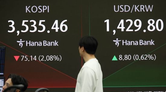 코스피가 장초반 2% 급락한 가운데 13일 서울 중구 하나은행 딜링룸 현황판에 코스피, 원/달러 환율 등이 표시돼 있다. 이날 코스피 지수는 전 거래일 대비 60.52포인트(1.68%) 내린 3550.08에, 원/달러 환율은 9.0원 오른 1430.0, 코스닥은 13.73포인트(1.60%) 하락한 845.76에 개장했다. 2025.10.13 조용준 기자