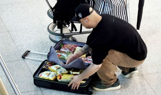 한 외국인 관광객이 인천공항 출국장 앞에서 한국 라면과 과자 등을 가득 채운 여행 가방을 정리하고 있다. 같은 과자라도 현지에서 사는 '오리지널'의 맛이란게 있다.