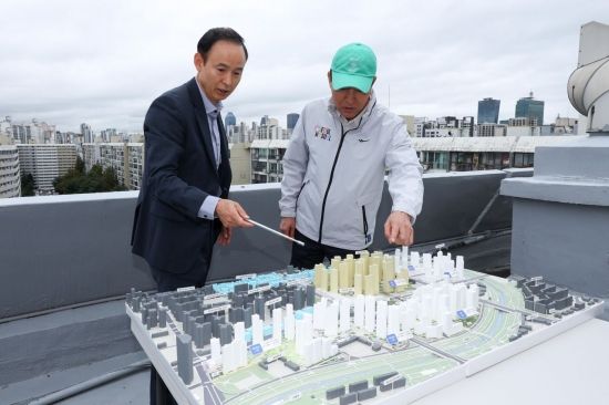 오세훈 서울시장이 13일 재건축 정비계획 변경안이 통과돼 재건축 정비사업에 속도가 붙은 서울 강남구 은마아파트를 방문해 대치동 재건축 단지계획도를 보고 있다.