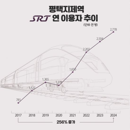 대규모 신도시 조성과 삼성전자 평택캠퍼스 효과로 SRT 평택지제역의 이용객이 7년 사이 3.6배 가까이 는 것으로 나타났다.